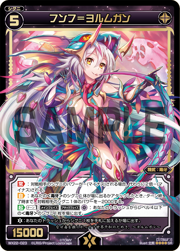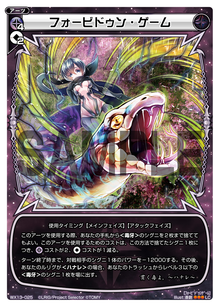 This is the SIGNI that makes Hanare, an already defensive juggernaut, to one that is almost unkillable. Lamia is also very good in the mid-game, when your opponent is trying to push damage using SIGNI that has double crush or a restand ability such as Swingride. Just by excluding Lamia, you are able to stop their offense and even trigger Ein-Tetrodo draw 1 effect.