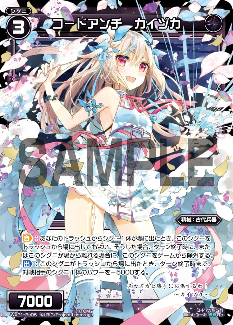 While Kaizuka is often seen as a defensive SIGNI, she can also be used offensively, allowing the player to call her out when a SIGNI is called from trash to field, creating a surprise attack to destroy your opponent. Such SIGNI includes Otagame and Nihoningyo.